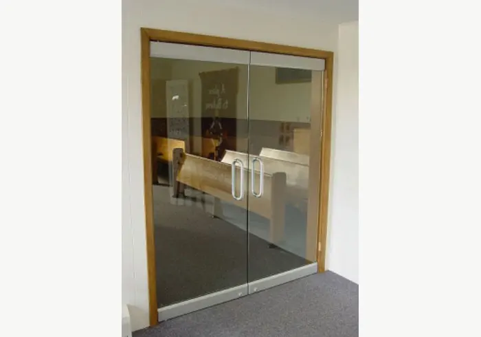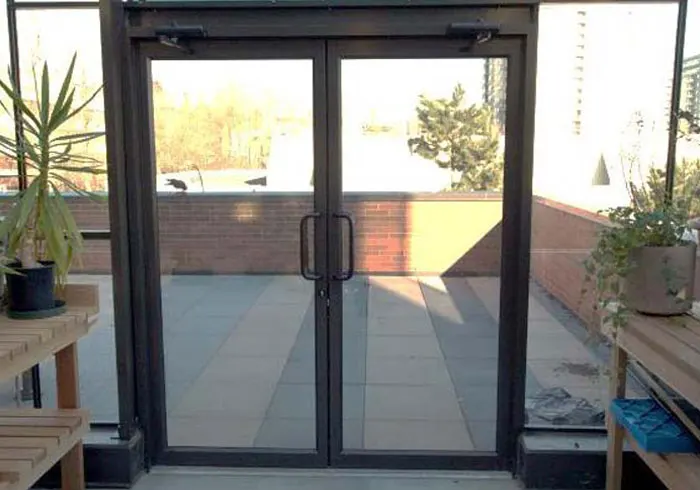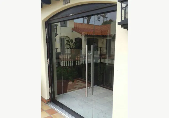 Pacifica Glass installed this commercial herculite door in Solana Beach, CA. The glass door is made with ½" clear tempered glass and bronze anodized aluminum. It features a sidelite stainless steel ladder pull with a back to back keyed cylinder outside and a thumbturn inside.