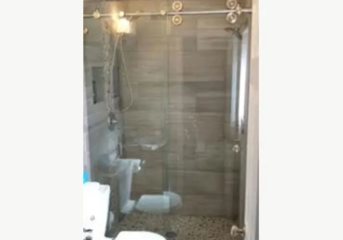 Pacifica Glass completed a residential glazing project in Rancho San Diego, CA. We installed a custom 3/8" clear tempered hydroslide shower enclosure with a barn door cut out.