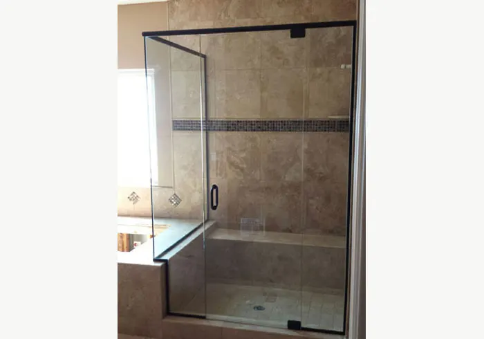 This residential shower door installation in Poway, CA features a single hinged door with a notched panel in line and a 90 degree return panel fabricated in ⅜" clear tempered glass with oil rubbed bronze hardware.