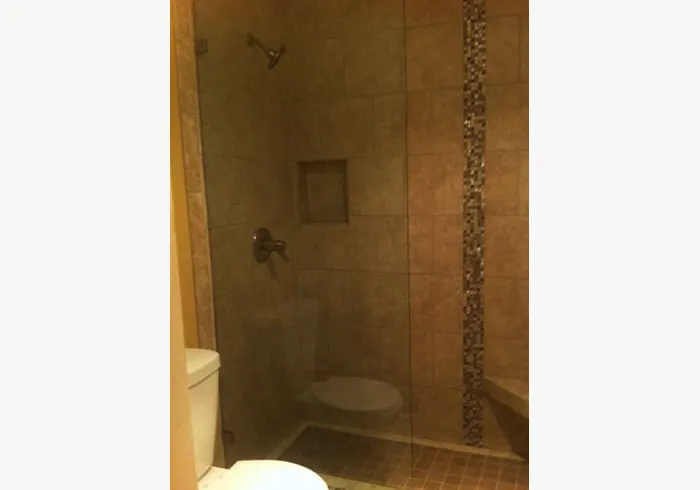 We completed a residential bathroom remodel in Rancho Bernardo, CA. Using clear tempered glass with polished edges and chrome hardware to secure the glass, we created a beautiful shower complete with a seat and a 90 degree return panel.